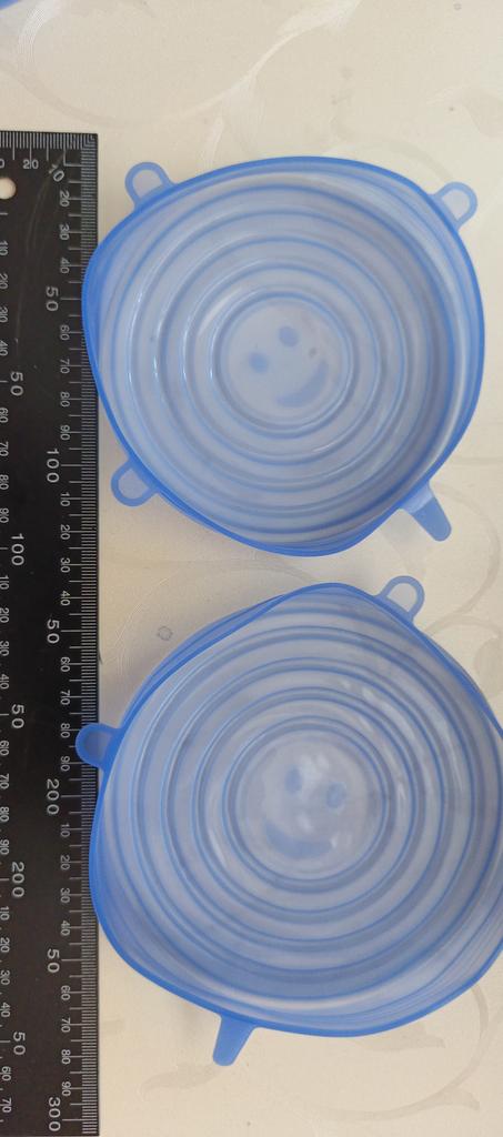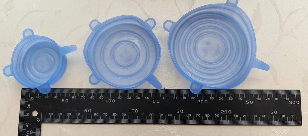 6 couvercles en silicone de différentes tailles. S'étirent bien. Adhèrent fermement sur la vaisselle. Pratiques à utiliser.