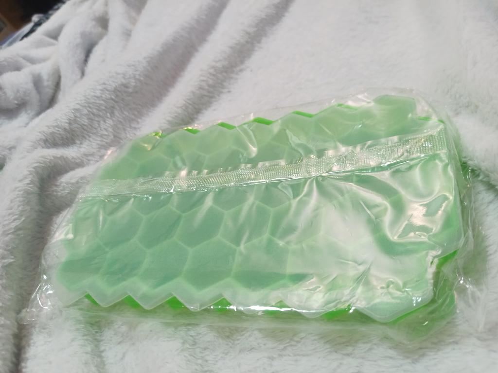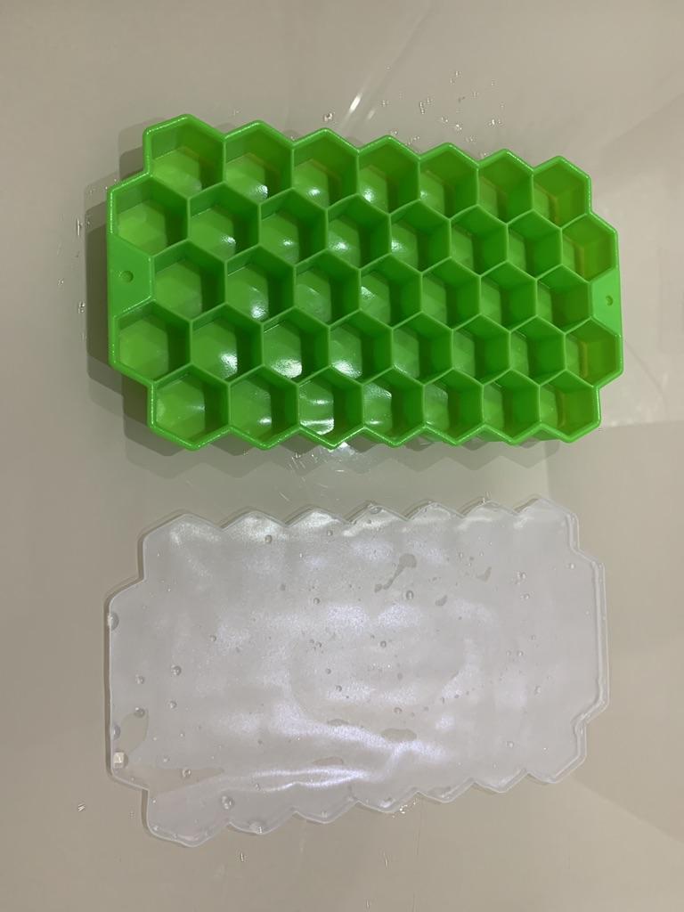 Je l'ai tout de suite mis au congélateur, c'est pratique pour récupérer la glace, la quasi-totalité rentre dans une tasse isotherme de 0,5 litre, dès qu'on verse de l'eau dans le nid d'abeilles, on le recouvre d'un couvercle, il colle à la surface de l'eau et empêche l'eau de s'écouler