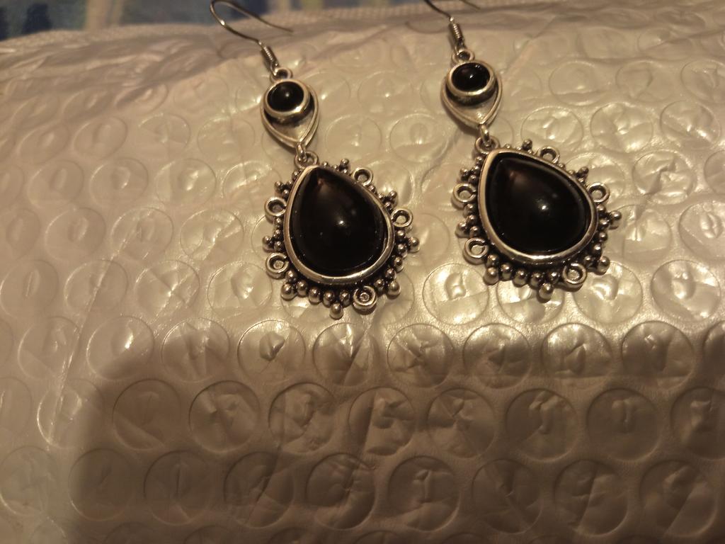 Boucles d'oreilles rétro créatives en forme de gouttelette avec incrustation de pierre noire, style bohème, couleur argent, métal moulé sous pression, boucles d'oreilles pendantes