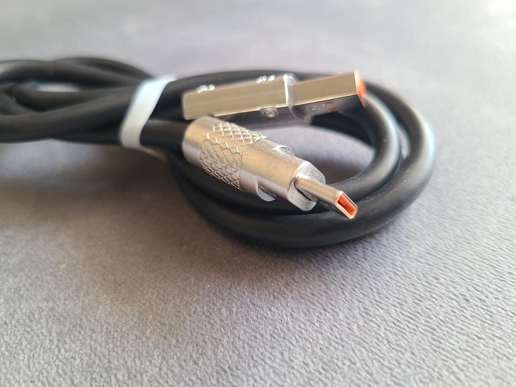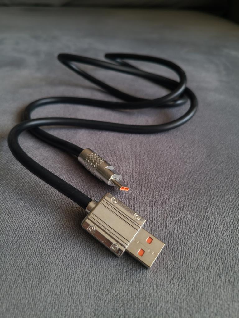 Câble de chargement USB vers Type-C pour un chargement ultra rapide Boîtier en silicone. Souple et agréable au toucher. Mais pas aussi doux que le câble bleu du même magasin l'a récemment montré. Personnellement, j'aime mieux la flexibilité de ce câble.. Convient pour une charge rapide et un transfert de données. Bande passante 120 W. Longueur d'un bord à l'autre 1,10 m Epaisseur 0,6 cm. Aucune sangle de fixation spéciale incluse. Il y a un indicateur sur le connecteur Type-C. Je peux le recommander 🤗