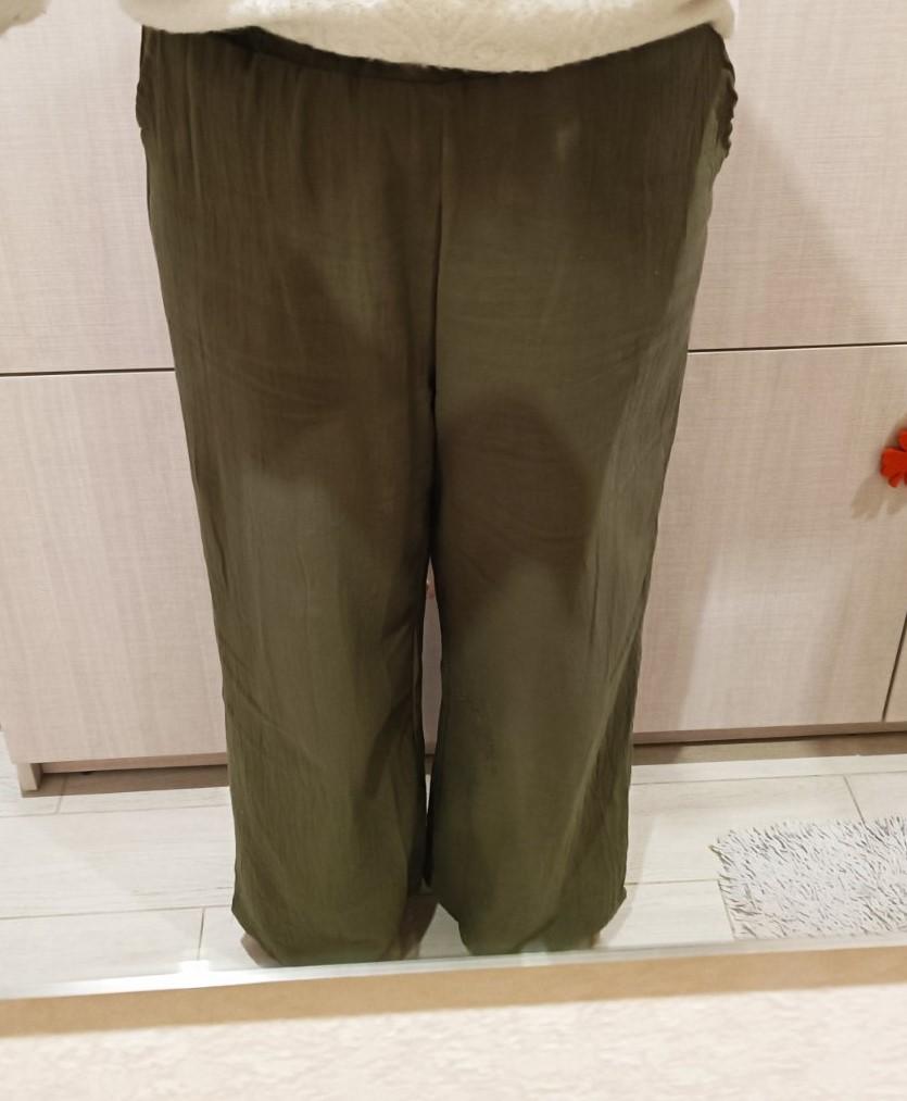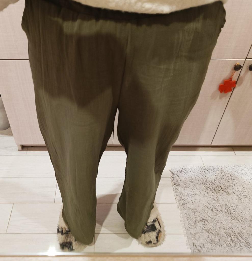 J'ai pris la taille 50. Pantalon large régulier. Tissu en coton. Sur la photo, ils ressemblent à un pantalon et une jupe. C'est faux. Il ne fait pas chaud en été.