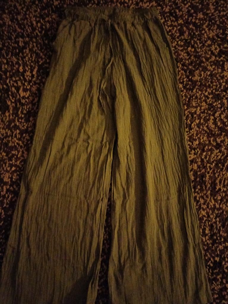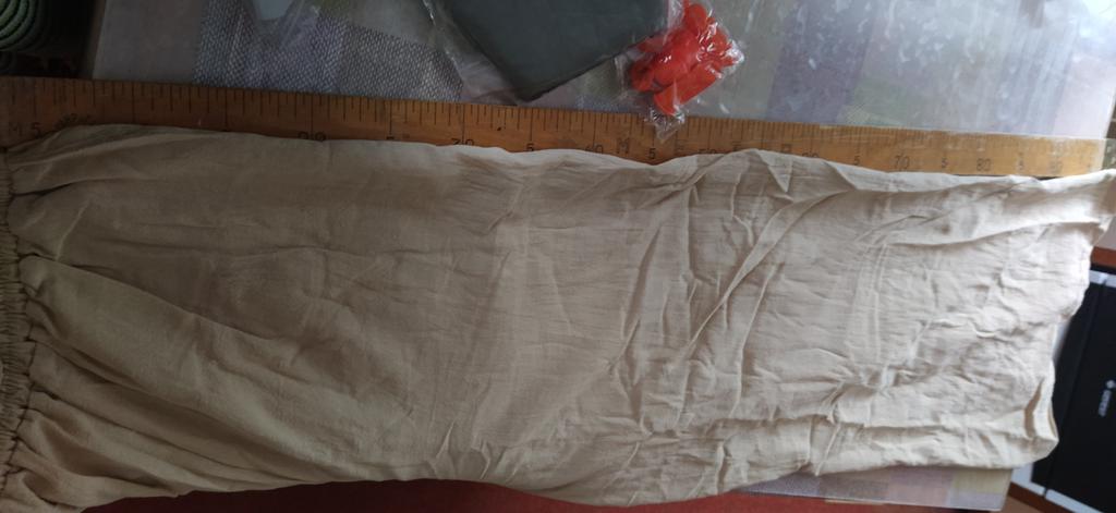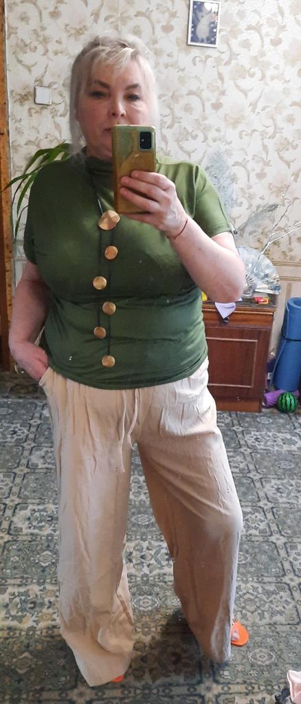 Pantalon - pas un gramme de lin. La coupe n'est pas la même que sur la photo (la photo montre un pantalon et une jupe), le pantalon est venu dans une coupe droite et régulière. Je m'attendais à quelque chose de différent, je n'aurais pas acheté le pantalon qui est venu. C'est très désagréable.