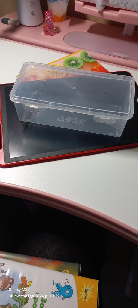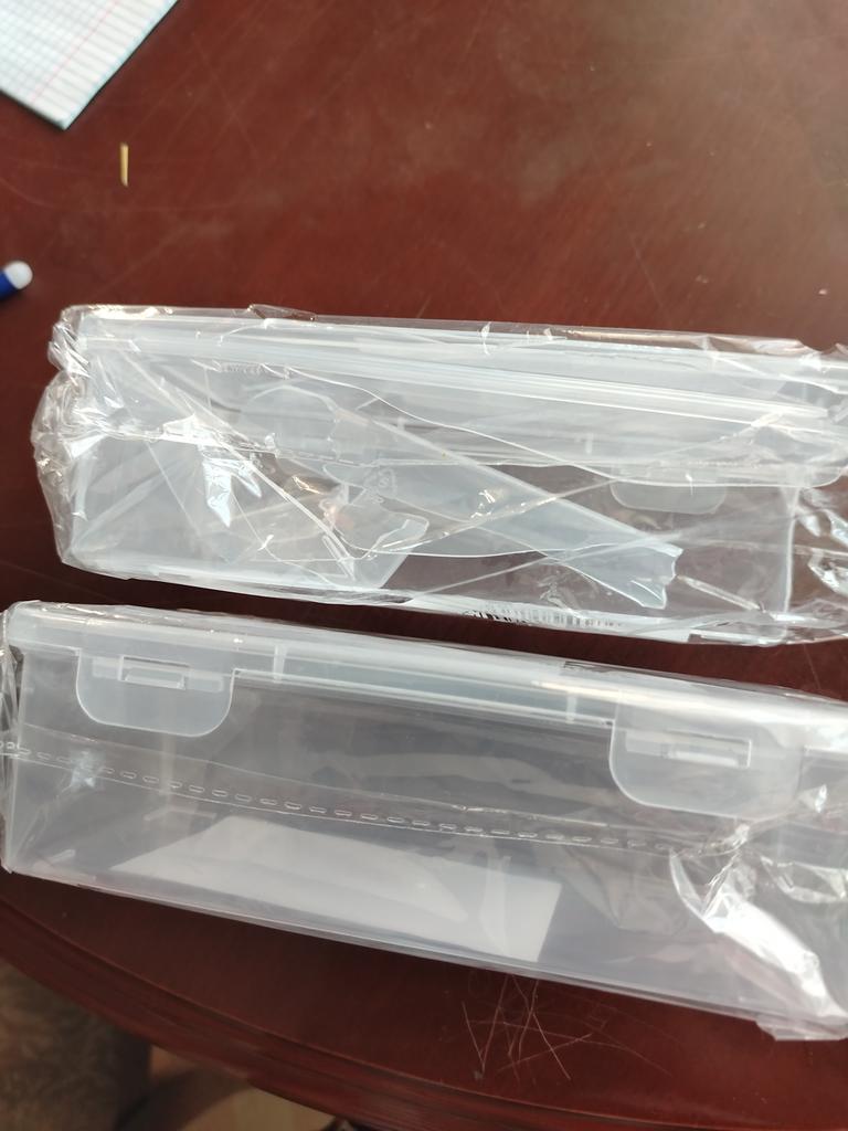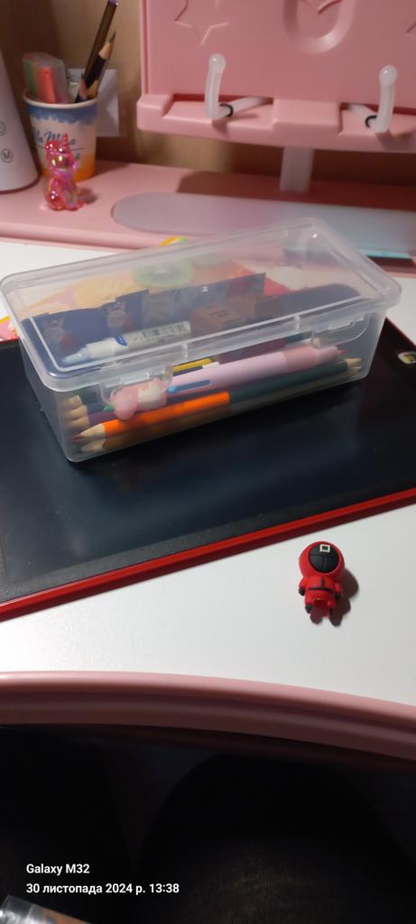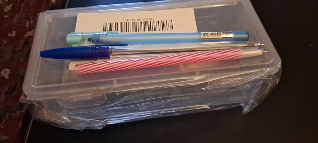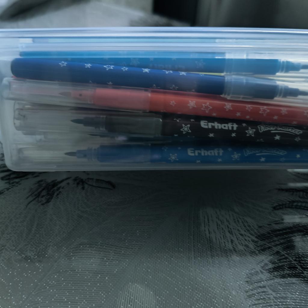 Boîte normale pour marqueurs, feutres, crayons. Le plastique est souple, ne sent pas. Merci !!!