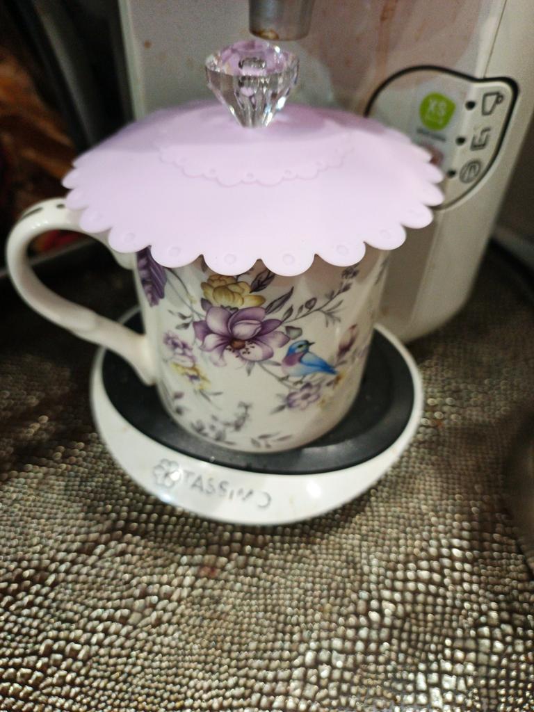Beau couvercle pour tasse, en silicone avec un support en forme de cristal - il est en plastique. Il a l'air sympa. Merci.