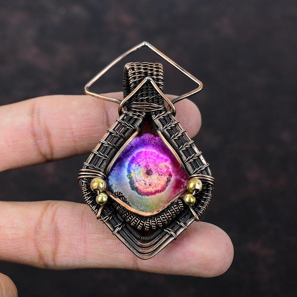 Pendentif Druse Quartz Solaire Arc-en-ciel Pendentif Enveloppé de Fil de Cuivre Pendentif Ethnique Fait Main Bijou en Cuivre Pendentif Pierre Précieuse Cadeau Occasion Spéciale