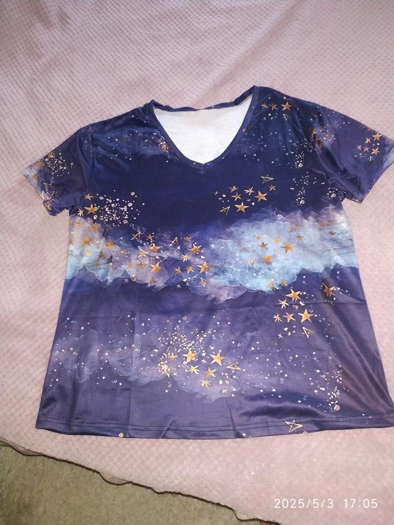Le t-shirt est ample, mais il convient bien pour l'été. La couleur n'est pas la même que sur la photo.