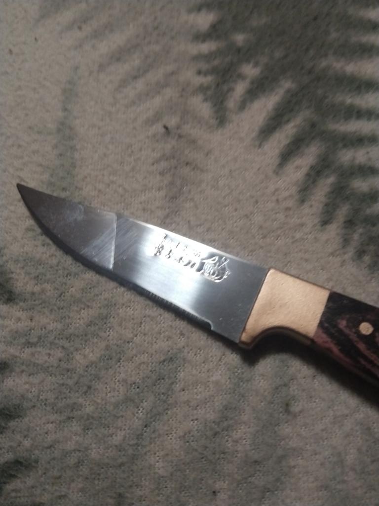 Le couteau sur la photo est plus beau qu'en réalité. Taille 15 cm, lame 7 cm. Manche - carton pressé peint. Les fourreaux ne sont pas en cuir, mais en similicuir. On peut nettoyer une pomme ou une pomme de terre, mais mouiller le carton avec de l'eau, ça ne dure pas longtemps.