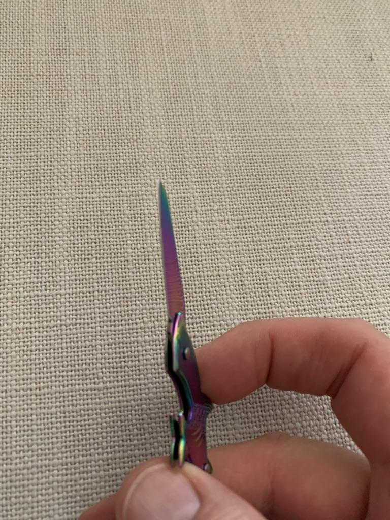 Couteau pliant requin Mignon, miniature, se plie un peu difficilement Prend peu de place, assez lourd Fait de metal Coupe correctement 👌