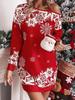 Robe d'automne et d'hiver pour femme, asymétrique épaule dénudée, ample, imprimé flocon de neige, couleur assortie, style de Noël, manches longues au-dessus du genou, mini robe