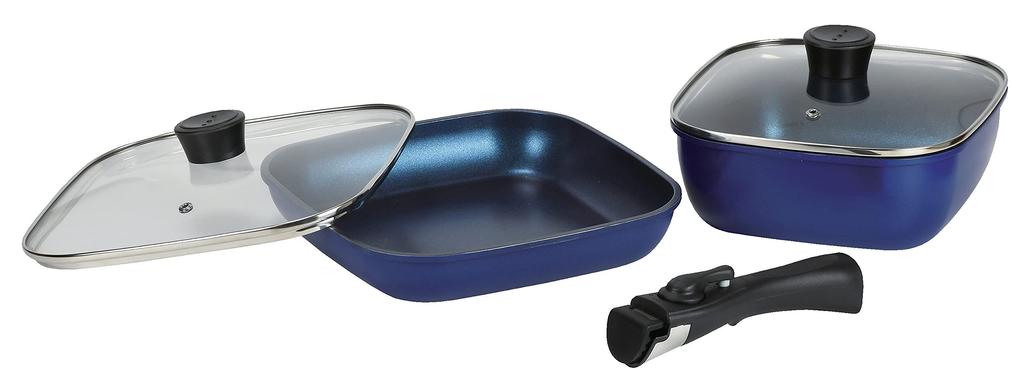 Taille du produit: (environ.) Poêle à frire profonde 20 x 20 cm (carré) / largeur 21 x profondeur 21 x hauteur 8 cm, poêle 24 x 24 cm (carré) / largeur 25 x profondeur 25 x hauteur 4,5 cm, couvercle en verre 20 x 20 cm/largeur 21,5 x profondeur 21,5 x hauteur 5,5 cm, couvercle en verre 24 x 24 cm/largeur 25,5 x profondeur 25,5 x hauteur 4 cm, poignée spéciale/longueur totale 19 x largeur 4,5 x hauteur 5,5 cm