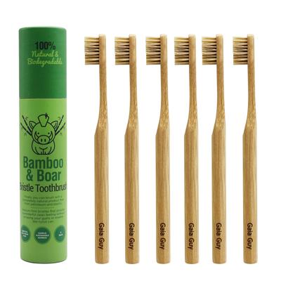 Brosse à dents en bambou à poils naturels entièrement biodégradable avec manche en porc zéro déchet Lot de 6 (Sans nylon) - 100% poils/bambou -