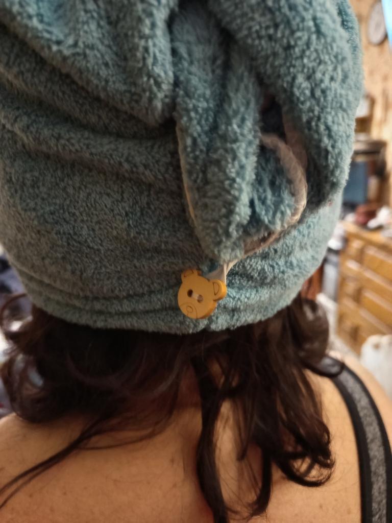Serviette très confortable et douce ! Elle absorbe bien, sèche rapidement ensuite et mes longs cheveux ont tenu dedans ! Je suis satisfaite !