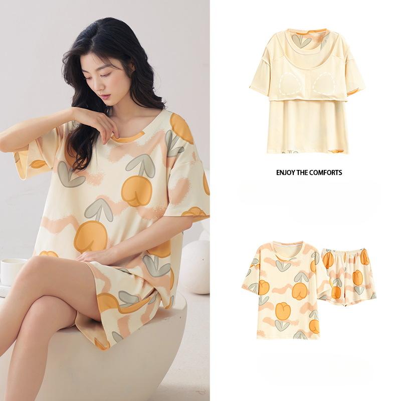 Pyjama d'été pour femme avec coussins, short mignon et doux, peut être porté à l'extérieur du costume en coton à manches courtes, vêtements d'intérieur