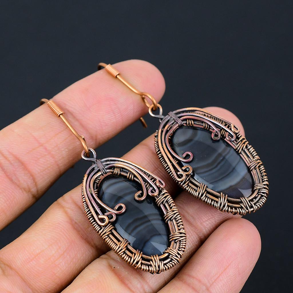 Agate rubanée noire Fait main Fil de cuivre enveloppé Bijou Boucle d'oreille 2.56 D5B60