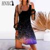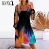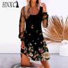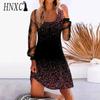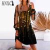 HNXC Robes décontractées à manches longues et col en U pour femmes, couleur unie, imprimé, taille haute, mode printemps-automne