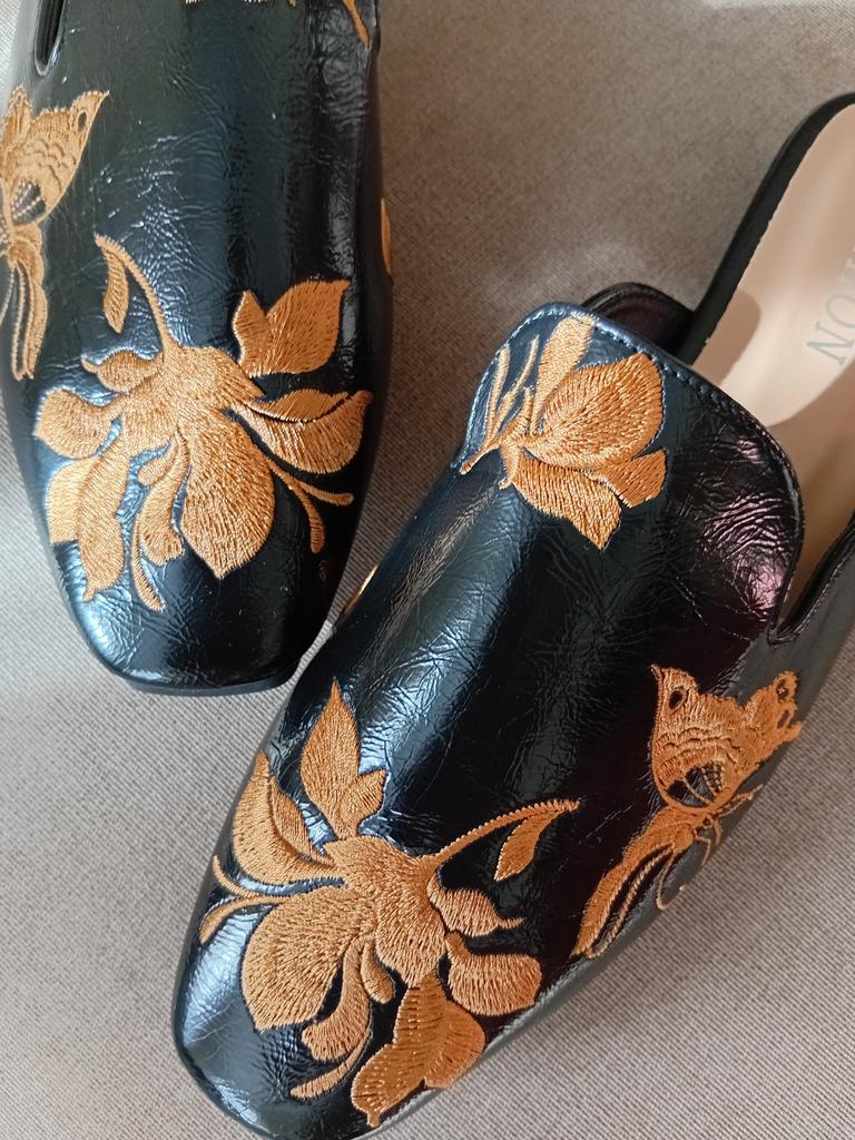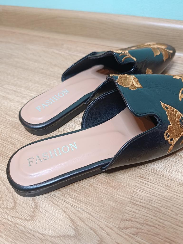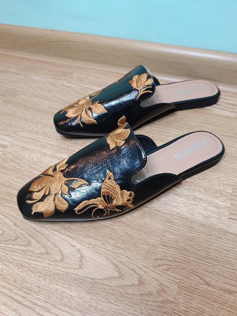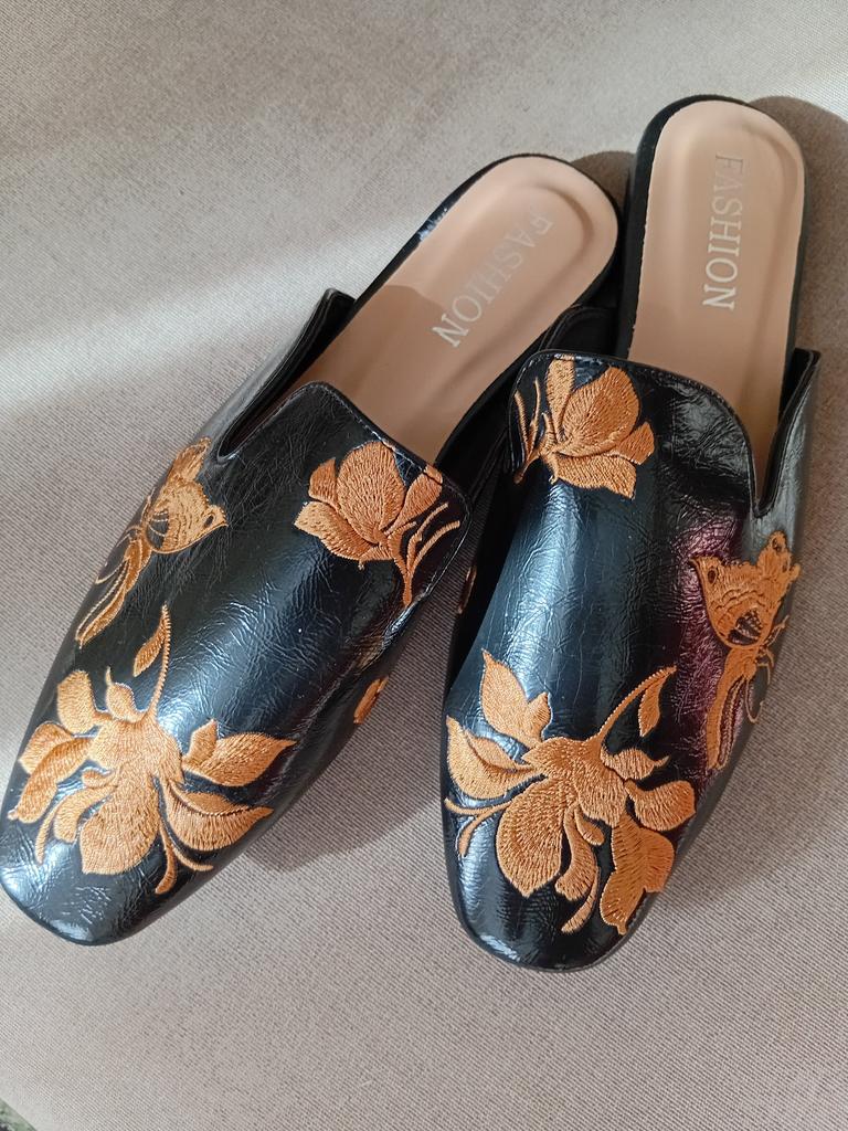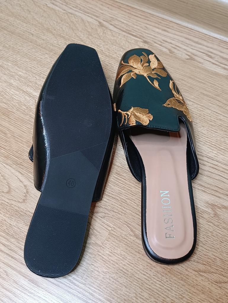 Magnifiques mules brodées 😌 Sur les jambes, ils sont très beaux, exquis. On peut s'y pavaner avec élégance à la maison ou se promener dehors.. La qualité est excellente, les finitions sont soignées. Aucune odeur étrangère. Pour un pied de 24,5, la taille 39 a parfaitement convenu. C'est l'amour 😍 Je recommande 🤗