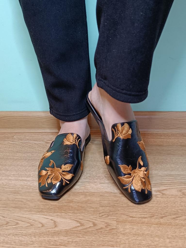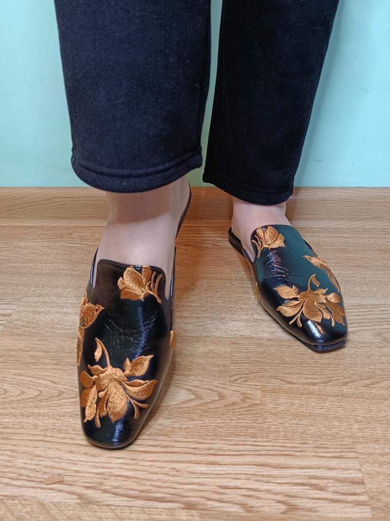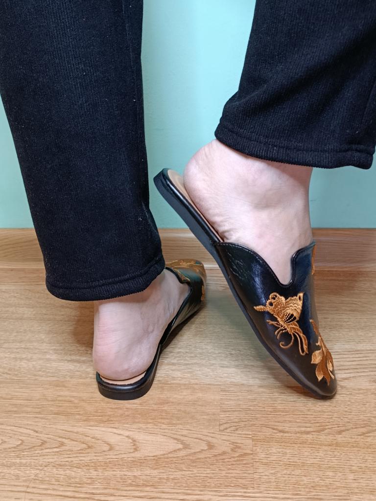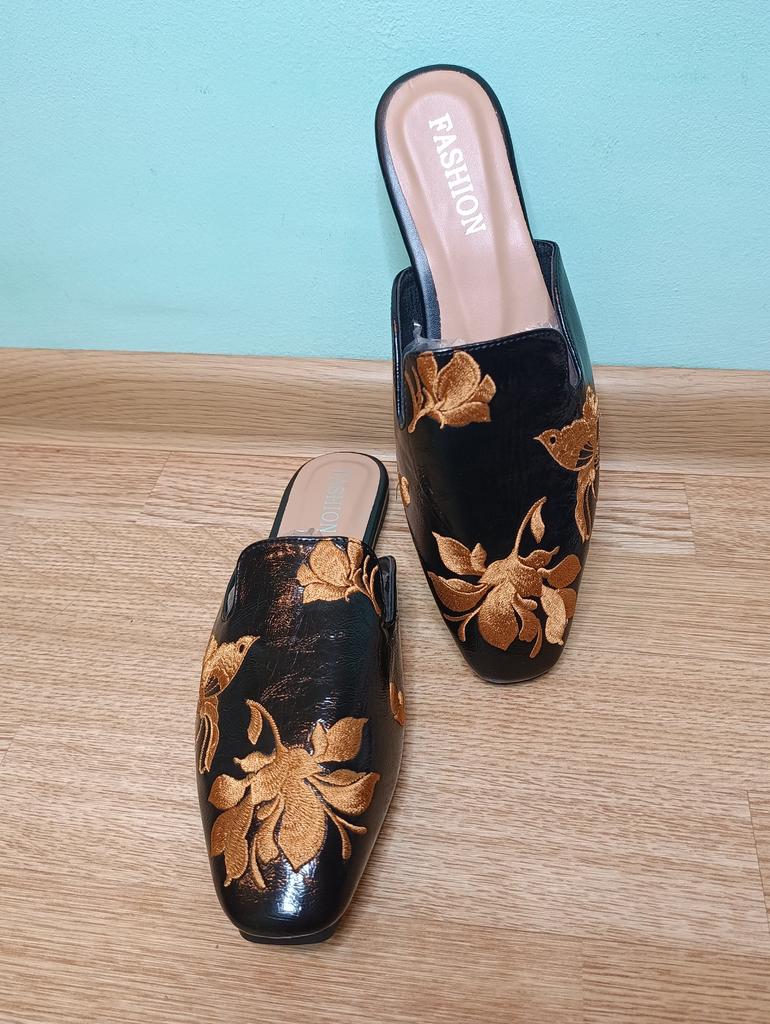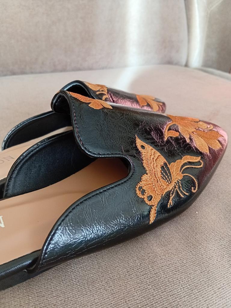 Magnifiques mules brodées 😌 Sur les jambes, ils sont très beaux, exquis. On peut s'y pavaner avec élégance à la maison ou se promener dehors.. La qualité est excellente, les finitions sont soignées. Aucune odeur étrangère. Pour un pied de 24,5, la taille 39 a parfaitement convenu. C'est l'amour 😍 Je recommande 🤗