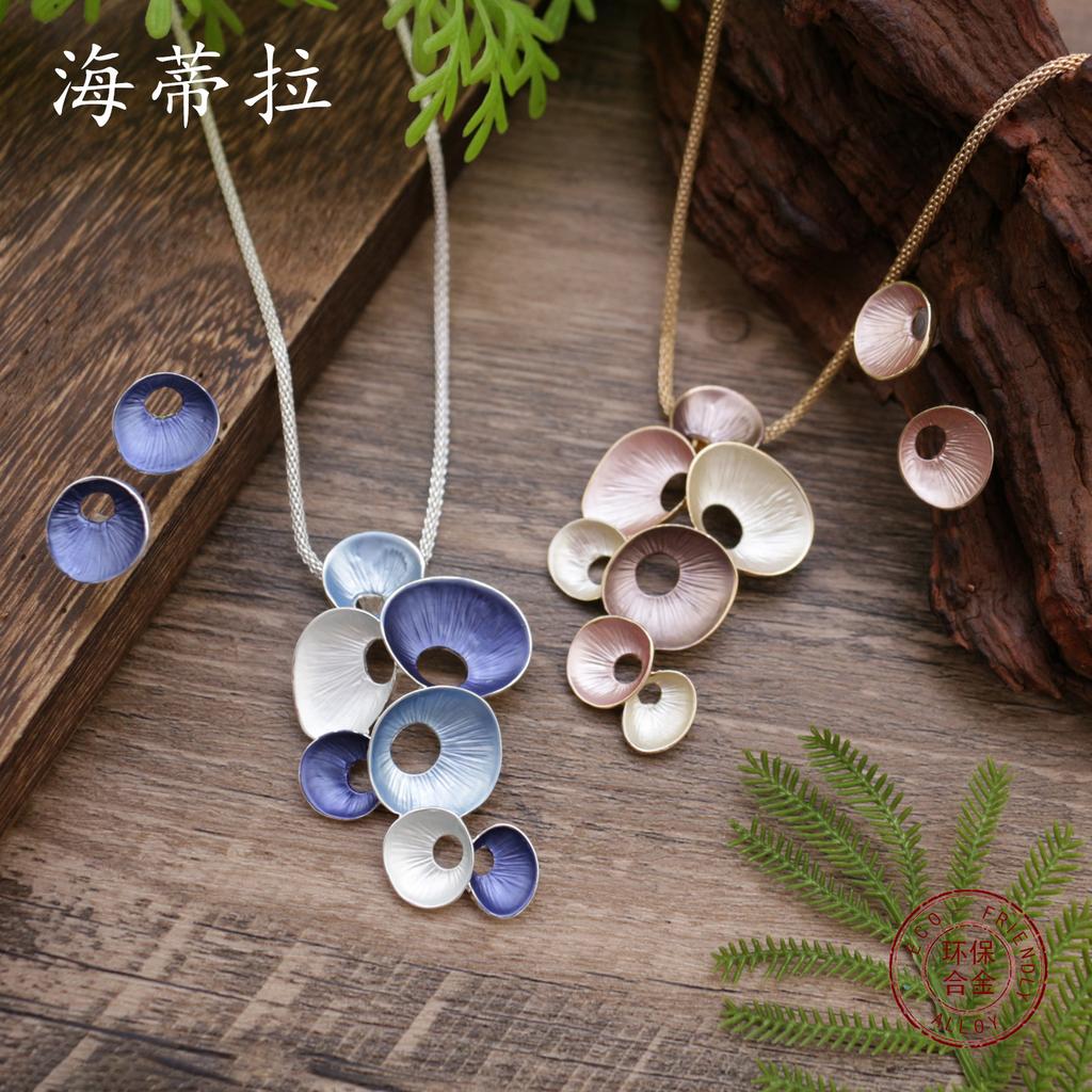 Nouveau set de boucles d'oreilles à clous et collier à pendentif fleur simple à pétales ronds creux couleur émail, mode femme