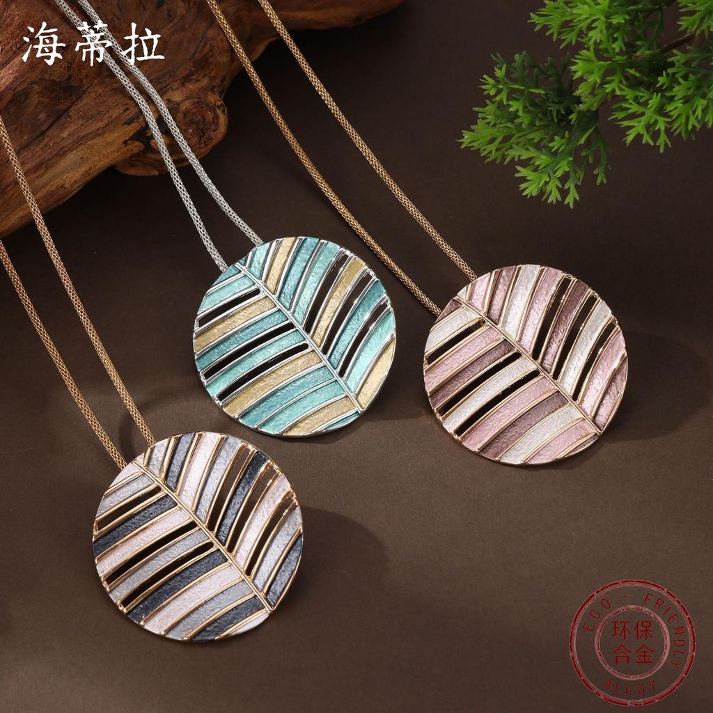 Nouvelle couleur émail creux rond géométrique feuille long pendentif personnalité femme collier long feuille ronde