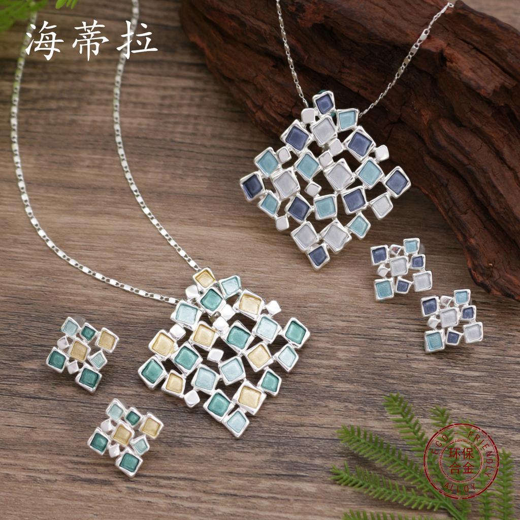 New enamel color hollow square stud earrings pendant set women's high-end geometric square necklace