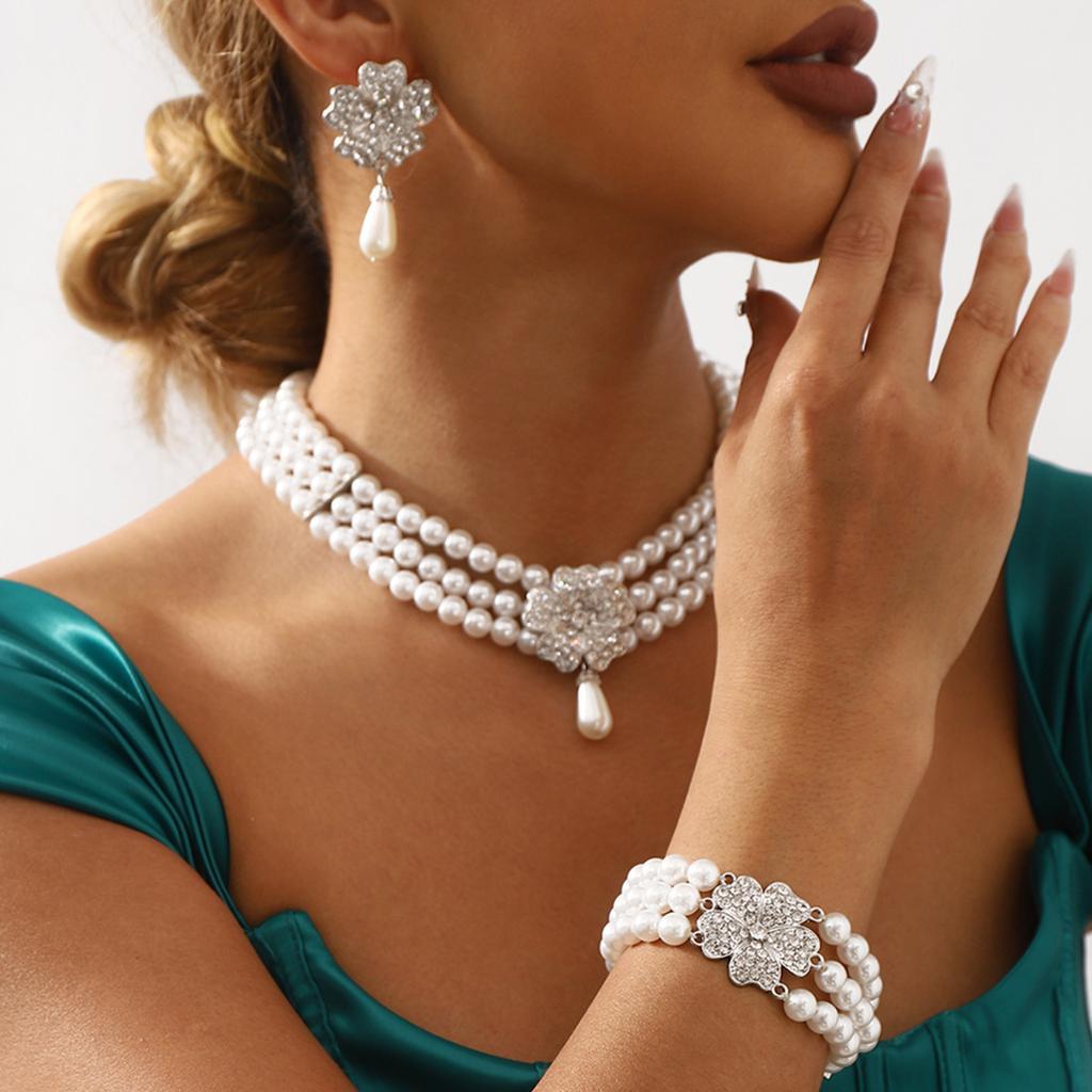 Tooxika French Temperament Flowers And Diamonds Accessories White Pearl Earrings Necklace Bracelet Set Of Three Bridal Jewellery