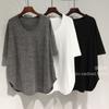 T-shirt basique simple et polyvalent pour femme, couleur unie, couture centrale dos, col rond, manches mi-longues, noir classique, blanc, gris