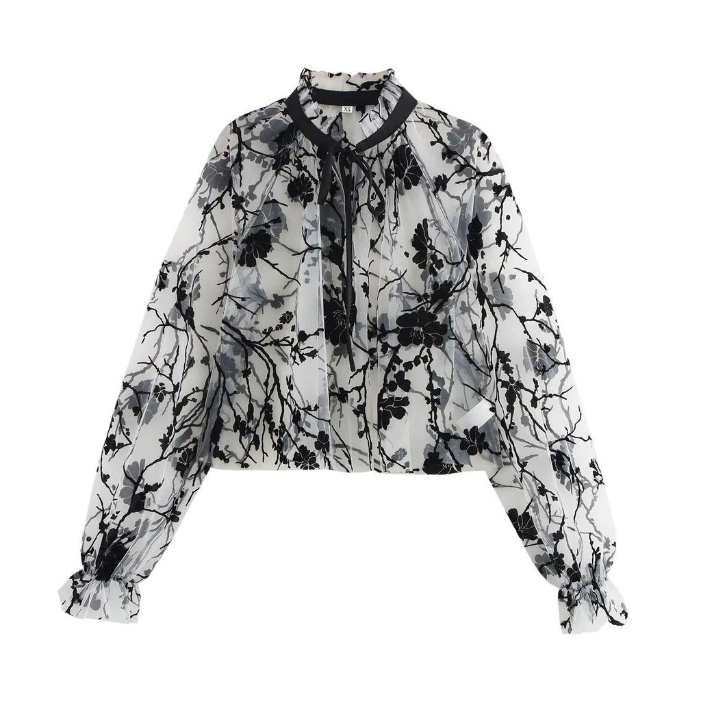 Introducing our latest addition to the Spring 2025 Women's Fashion line, this sheer long sleeve top blends European and American styles for a chic and elegant look. Crafted from high-quality polyester, it offers a lightweight and comfortable fit. The design features a sophisticated stand neckline and long sleeves, perfect for layering or wearing on its own. Ideal for both daytime and evening wear, this top is a versatile piece for any fashion-forward wardrobe.