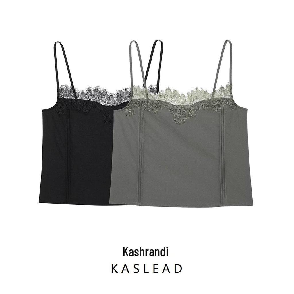 2025 Spring Women's Stylish Grey Lace Trim Spaghetti Strap Top