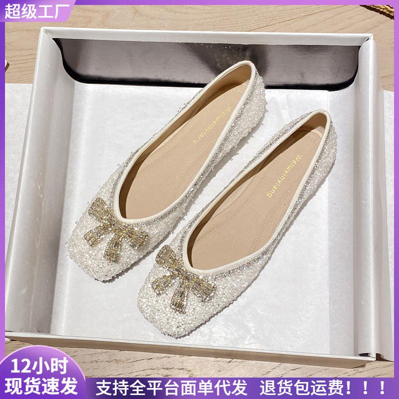 Square head single shoes women's flat bottom one pedal bow rhinestone spring ladyshoes women