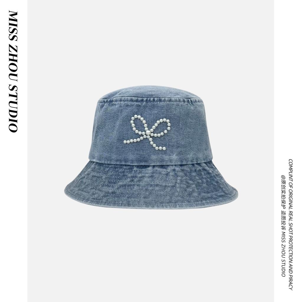 Sweet and cute pearl bow fisherman hat children shopping retro casual denim basin hat