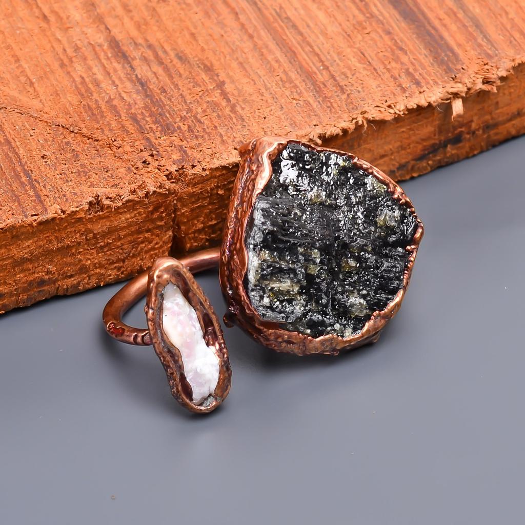 Vente Fête des Sœurs Tourmaline Noire Naturelle Électroformée Cocktail Nouvelle Bague Cuivre V-39