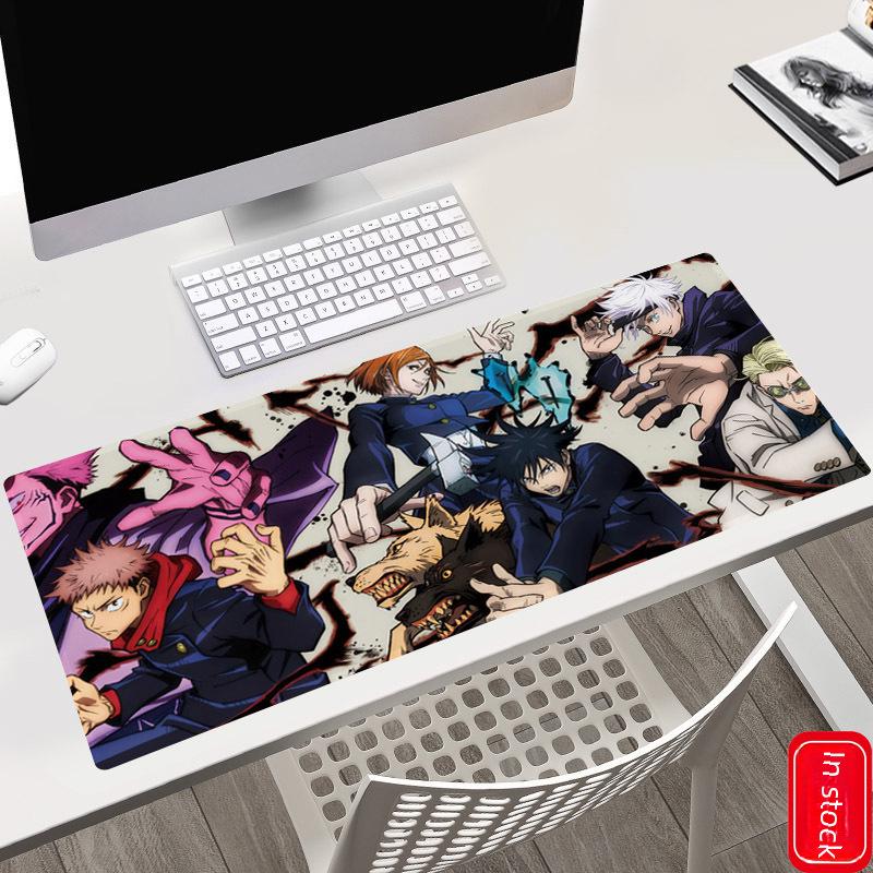 Tapis de bureau Jujutsu Kaisen 40x90x0.3CM avec les personnages Gojo, Yuji et Megumi.