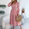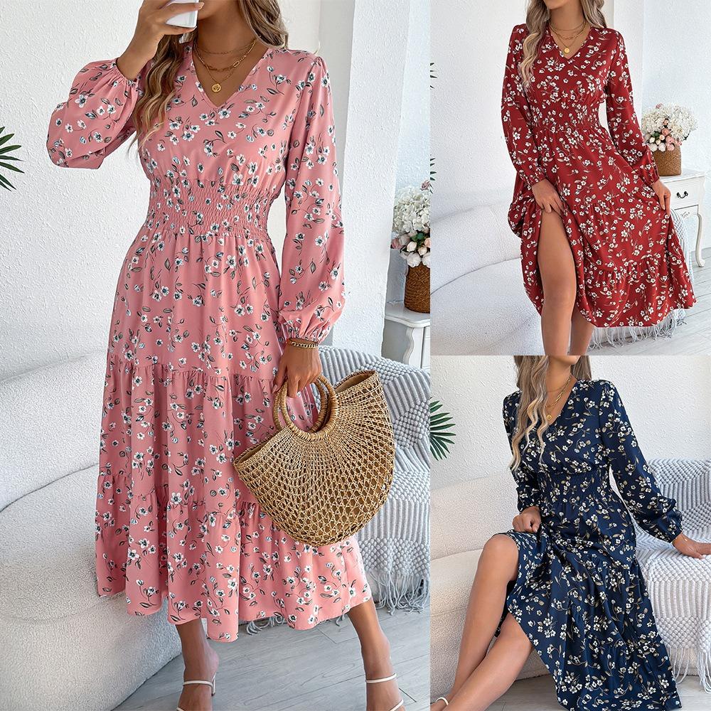 Robes Femme Mode Élégantes Florales Col V Manches Longues Taille Volants A-Ligne
