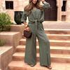 Cet ensemble décontracté pour femme élégant comprend une chemise en lin gris clair avec un design noué sur le devant, révélant un aperçu du ventre pour un look tendance.. Le pantalon taille haute à jambes larges complète le haut, offrant une silhouette décontractée mais chic.. Parfait pour un ensemble décontracté mais à la mode, cet ensemble est idéal pour les sorties par temps chaud.