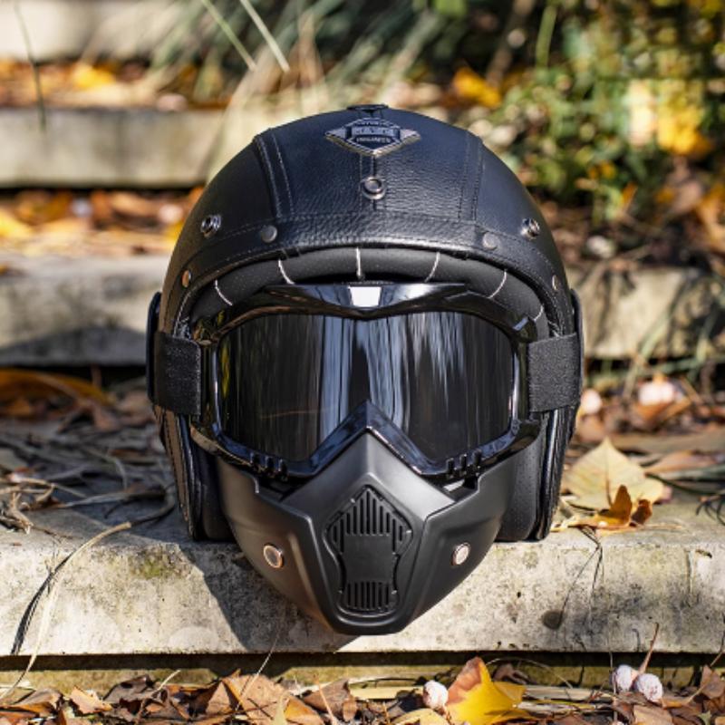 Newest Black Leather Open Face Motorcycle Helmet With Mask Scooter Riding Caque Classic Electric Motorbike Jet Cascos Para Moto