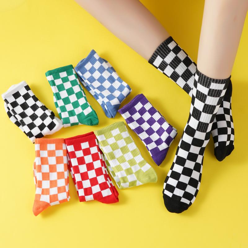 3 Paires Femmes Chaussettes en Coton Respirantes Mi-Mollet Mode Drôle Noir Blanc Carreaux Plaid Chaussettes Décontractées