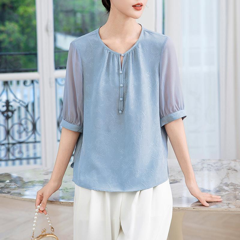 Silk shirt women's dress new silk shirt temperament round neck age-reducing mulberry silk short-sleeved top