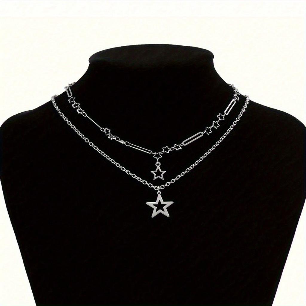 2 pièces Pendentif Étoile Pentagramme Argenté Multi-Couches Collier Chaîne Fait Main Adapté au Port Quotidien des Femmes