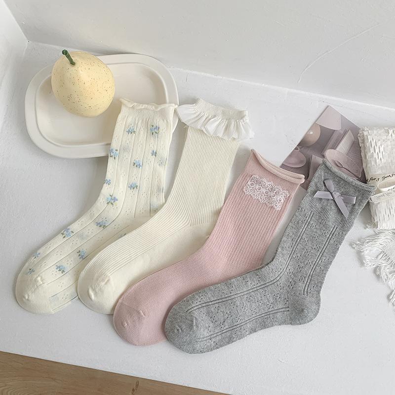 Ladies Spring and Summer Thin Literary Small Flowers Sweet Bow Boneless Curled Rim In The Tube Stack Socks