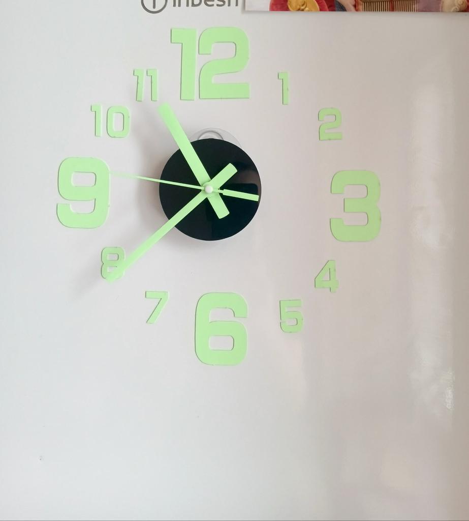 Horloge murale 3D Fonctionne avec une pile AA (non incluse). Inclus: ✅Mouvement avec aiguilles ✅Chiffres ✅Pochoir pour un collage mural correct. ✅Mode d'emploi Matériel - acrylique. Dans l'obscurité, les aiguilles brillent (elles accumulent la lumière du soleil ou de l'éclairage domestique pendant la journée et s'illuminent dans l'obscurité). Arrivés conformément à la commande. Satisfait de la commande.