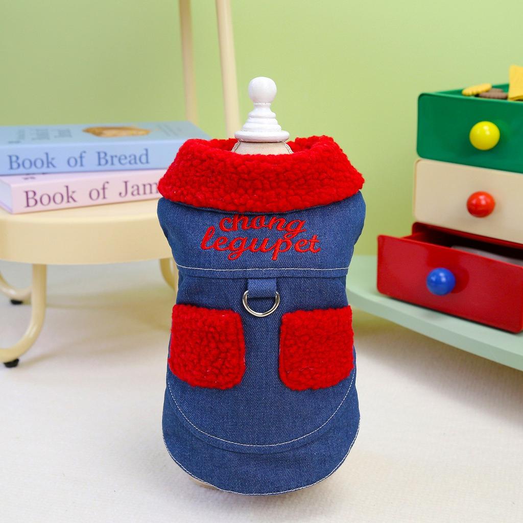Pet dog clothes autumn and winter thickened warm denim cotton-padded clothes with traction ring vest