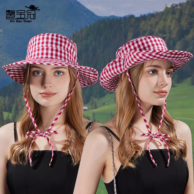 Spring and summer big brim outdoor hiking hat plaid strap bucket hat big head circumference sunshade sun protection hat children