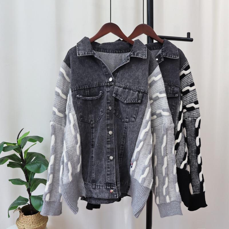 Denim splicing sweater jacket autumn and winter new design sense loose lapel contrasting color knitted cardigan women