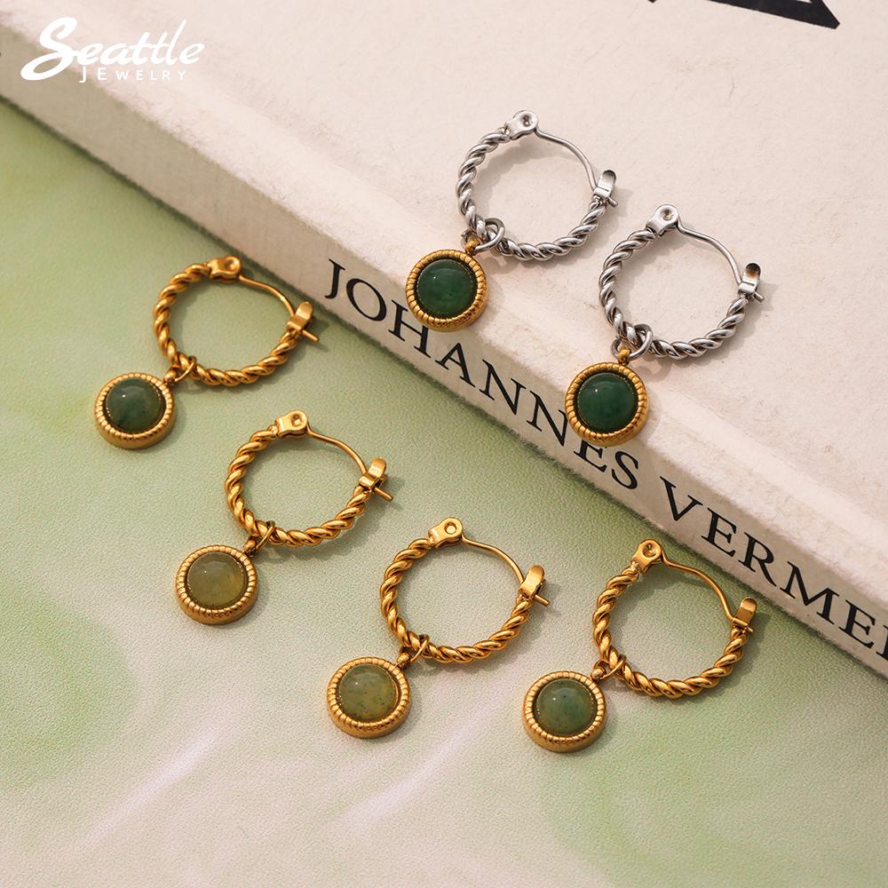 Acier Inoxydable Couleur Or Alliage de Zinc 18K Boucles d'Oreilles de Luxe pour Femmes Agate Verte Naturelle Rondes Pendantes Dames Vintage Zircon