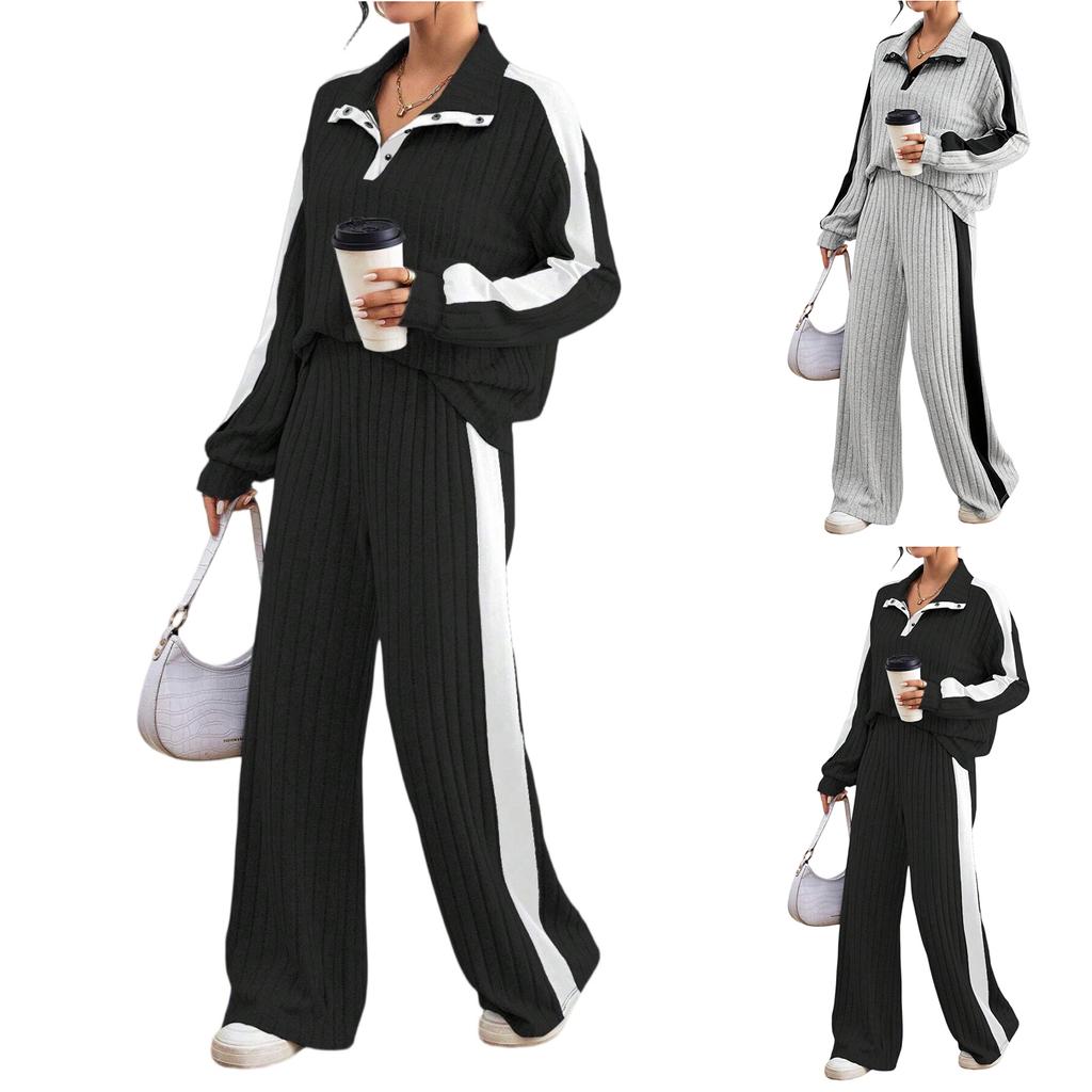 Ensemble Haut Décontracté Ample et Confortable à Capuche avec Cordon de Serrage et Fermeture Éclair Color Block pour Femme, Pantalon Couleur Unie