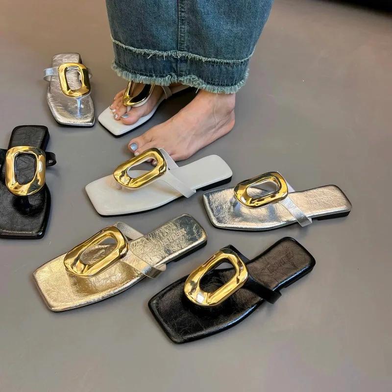 Mode Taille 35-43 Grande Taille Chaussures pour Femmes Tongs à Bout Ouvert Été pour Femmes Cent Double Orteil Décontracté Plat Boucle Métallique Sandales