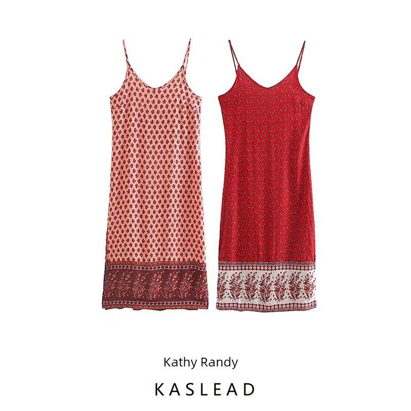 Kaslead New Women clothes Western Style Fashion Red Cashew Nut Rayon Positioning Print Suspender Skirt