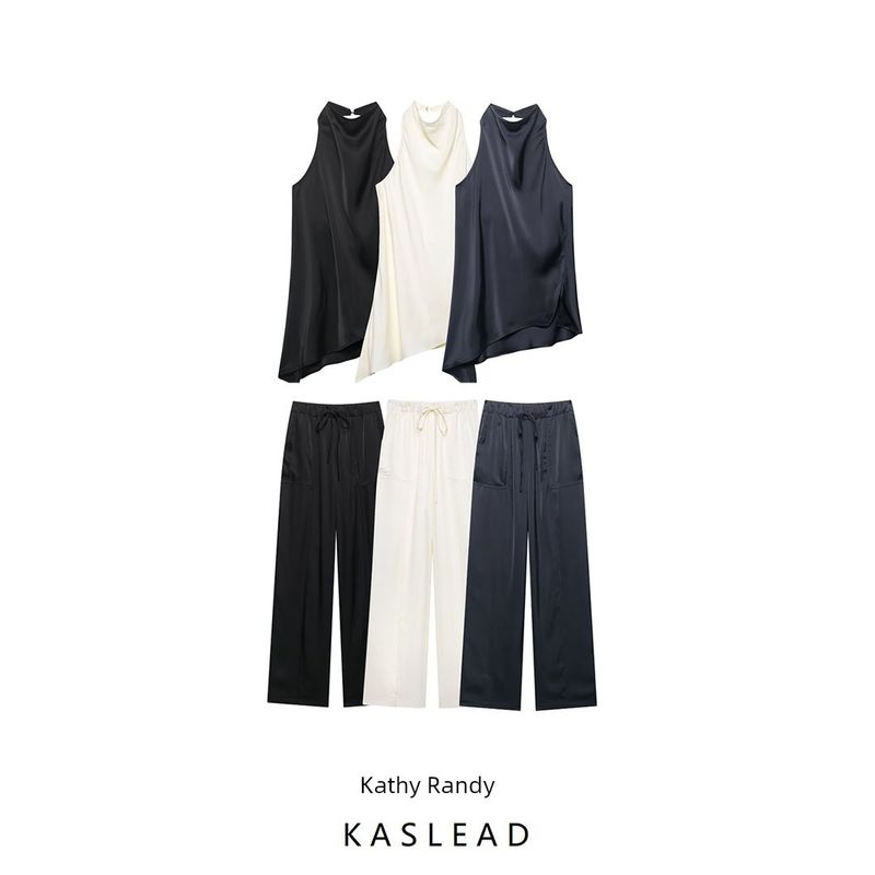Kaslead New Women clothes Western Style Silk Satin Texture Hanging Neck Top Trousers 2754253 2706253