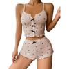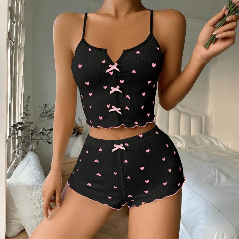 Ensemble pyjama camisole à imprimé cœur et nœud - Ensemble deux pièces confortable en côtes pour la détente