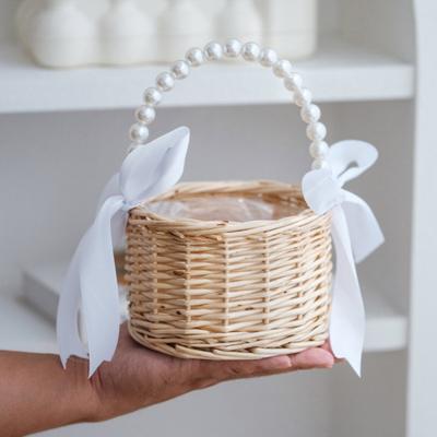 Panier en Osier Rotin Fait Main Panier de Fleurs de Mariage avec Poignée en Perles Faux Panier de Demoiselles d'Honneur pour Décoration Intérieure Douche Nuptiale Pique-nique